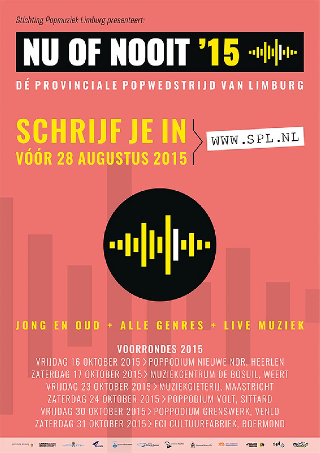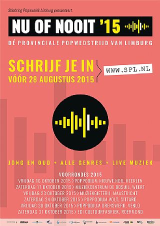 Vanaf deze maand start Stichting Popmuziek Limburg met de voorbereidingen van dé provinciale popwedstrijd Nu of Nooit. Muzikanten uit de hele provincie kunnen zich vanaf vandaag gratis inschrijven voor de wedstrijd en meedingen naar de hoofdprijs: het felbegeerde optreden tijdens het prestigieuze Pinkpop festival. De zes voorrondes van Nu of Nooit vinden vanaf oktober 2015 plaats in de grootste poppodia verspreid door de hele provincie. De finale zal dit jaar plaatsvinden in de Limburgzaal (Parkstad Limburg Theaters) te Heerlen.