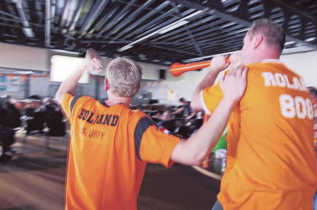 “Had op het werk geen groot scherm gestaan, had ik vrijaf genomen. Al is het met de collega’s wel gezelliger dan thuis. Alleen is er hier geen biertje”, zegt Wilbert Janssen. Alcohol blijkt niet nodig voor de sfeer. Wanneer Kuyt scoort, blazen de Oranjegekken op hun oranje vuvuzela’s en baas Frans rijdt een grote basdrum het zaaltje binnen om er dan lustig op los slaan. En dan zingen ze samen ‘Wat zijn die Denen stil…’ In Nederlandse bedrijven kan geen enkele teambuildings-activiteit op tegen het WK. Tenminste als de chef het goed aanpakt. “In het bedrijf tegenover ons was er vanmiddag tumult. De arbeiders mochten niet naar de match kijken, terwijl de bedienden op kantoor tv-toestellen hadden geplaatst. Dat kan dus niet. Ofwel iedereen, ofwel niemand”, zegt Frans Swinkels. Na het affluiten is de oranje werkvloer in enkele minuten weer een productievloer met gemotiveerde werkkrachten. De volgende Oranje-duels zijn tijdens het weekend en in de avonduren. “En tegen dan liggen ze eruit”, plaagt Jos uit Tongerlo.
