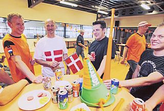 Zo’n 35 arbeiders van de pauken- en blaasinstrumentenfabriek hebben zich in oranje shirt gestoken. “Zie je die drie Denen daar. Dat zijn de Belgen”, roept Wilbert. “Hij is zelf een halve Belg. Hij is in Dilsen komen wonen, voor het financieel voordeel”, antwoordt Jos Bakkers (50) uit Tongerlo (Bree). Zelf is hij niet zo’n grote voetbalfan maar hij houdt wel van de sfeer. “Eigenlijk ken ik niks van voetbal. Vanochtend heb ik op internet de Deense vlag opgezocht. Die heb ik op een wit T-shirt geverfd. Gewoon om te plagen.” Zijn Belgische collega’s kleurden op het werk nog snel een A4-blad met rood en wit en plakten dat op hun rug. Ze kijken toch wel op van die dolle Oranjekoorts “Knettergek, zijn ze”, lacht Wilfried Wellens (42) uit Opitter. “Ondenkbaar in België, maar wel leuk.”