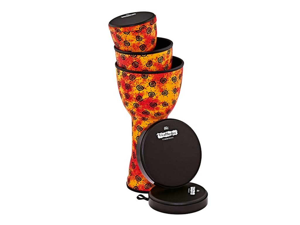 The Meinl VivaRhythm 3-In-1 Djembé set bevat drie verschillende maten djembé (8"-12") voor hoge en lage tonen. De 10" en 12" drums zijn voorzien van Meinl VivaRhythm Pop Off Djembé Vellen. Zonder de vellen zijn de drums in elkaar te stapelen, zo is het mogelijk om de drums gemakkelijk te transporteren en op te slaan. De vellen zijn gemakkelijk terug te plaatsen en hoeven niet afgestemd te worden. De Pop Off vellen zijn ook te gebruiken als hand drums die bespeeld kunnen worden zonder dat daar iets anders aan te pas komt. De kleine 8" drum heeft een vast afgestemd vel dat hoge tonen produceert met veel attack.