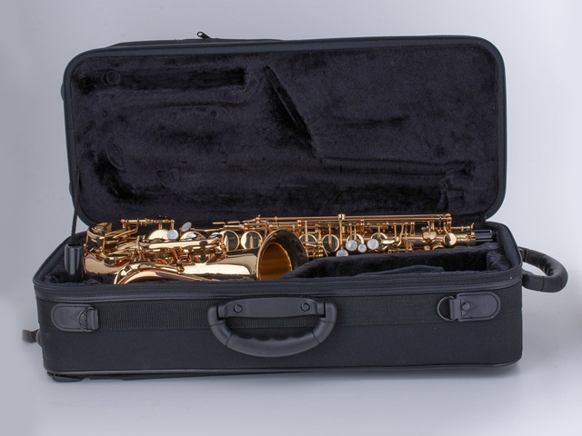 Berg in het koffer alleen je instrument op. Voor je lessenaar en muziekstukken kun je het beste een apart vak of zelfs een aparte tas gebruiken. In het koffer horen alleen het instrument, een paar rieten, je saxofoon riem en je mondstuk te liggen.