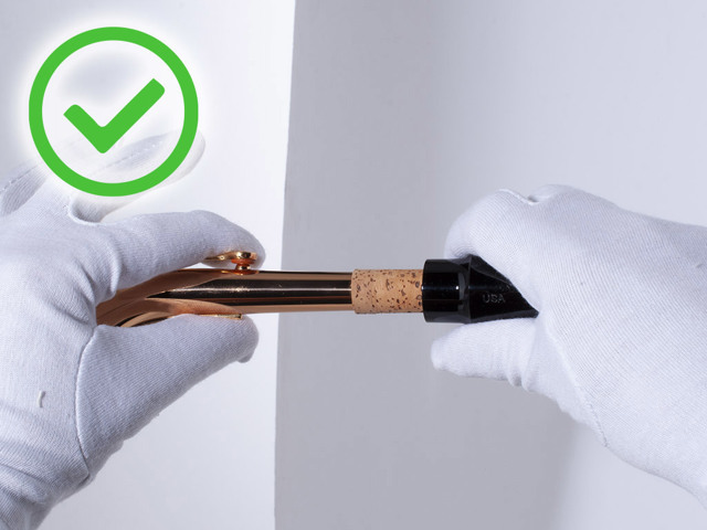 Het mondstuk zet je op de hals door het recht tegen de hals te zetten en dan erop te draaien. Schuif het er niet op. Schroef het mondstuk tot ongeveer twee derde op de kurk. Loopt dit niet soepel? Gebruik dan wat kurkvet op de kurk van de hals.