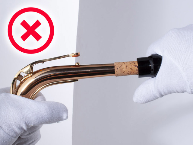 Zet eerst het mondstuk op de hals en dan pas de hals op de saxofoon, om schade aan de hals te voorkomen. Hou bij het afstemmen ook de saxofoon hals goed vast zodat deze niet kan verbuigen door de druk die erop komt wanneer je het mondstuk wilt verplaatsen.