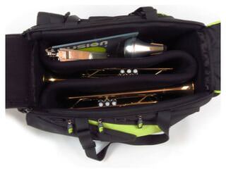 De Fusion Premium Triple Trumpet Bag is ontworpen om 3 Trompetten ergonomisch te kunnen vervoeren terwijl deze goed beschermd is. De tas is aan de binnenkant voorzien van een dikke gestoffeerde foam laag welke ervoor zorgt dat uw Trompetten goed beschermd zijn. De tas heeft rugzakriemen waardoor hij makkelijk te vervoeren is. De tas is gemaakt van waterafstotend polyester en heeft meerdere vakken waar u eventuele accessoires makkelijk in kwijt kunt.